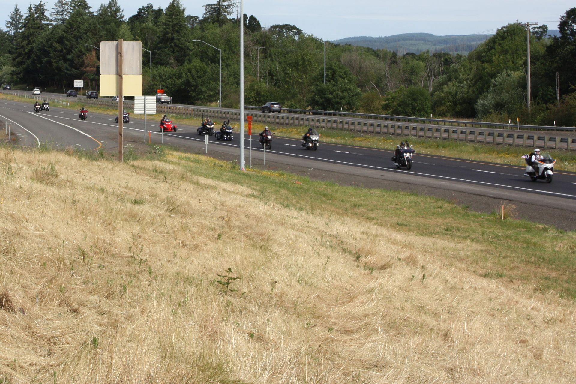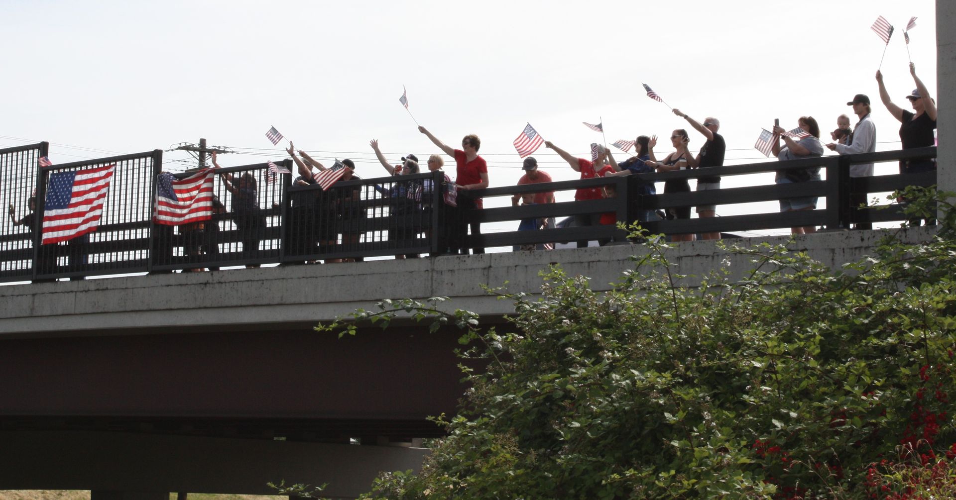 The Oregon Motorcycle Veterans Association (OMVA) were instrumental in Highway 26 from Seaside to Ontario being designated the Oregon POW-MIA Memorial Highway several years ago. Their two-day ride from Seaside to Ontario is to celebrate the designation and erect signs along the highway. North Plains residents greeted the Memorial Ride Saturday morning from the Glencoe Road overpass.